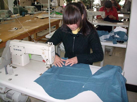 五、工作服的縫制:在針距密度中規(guī)定明線(包括不見明線的暗線)的針距,每3cm 14—18針。面料的品種很多,為保證產(chǎn)品的外觀和牢固,不同的面料應(yīng)選不同的針距。如硬質(zhì)面料的針距可以稀一點(diǎn),質(zhì)地松軟的面料針距可以密一點(diǎn)。縫制部位的線路不準(zhǔn)隨便彎曲,要符合工作服的造型的需要;線路要整齊,不重疊,無跳針、拋線,針跡清晰好看,縫制的起止回針要牢固,搭頭線的長度要適宜,無漏針、脫線現(xiàn)象,縫線松緊要與面料厚薄、質(zhì)地相適應(yīng)。