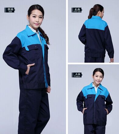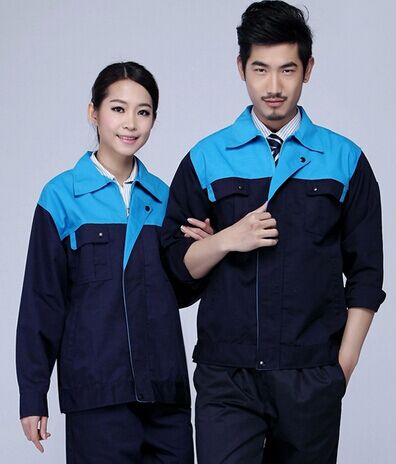 高檔工作服以藏藍色為主色,胸前采用藍色撞色拼接,醒目,工作感強,走線細致,實用性強。左中腰間口袋均采用雙層設計,傾斜線條,穩重大氣