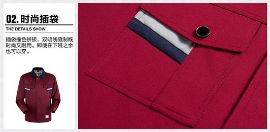 JL-QD203東莞廠服以棗紅色為主色,插袋采用拼接,夾克式袖口設計,左肩筆袋,精致時尚,工作中非常方便