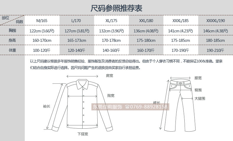 155(S)、165(M)、170(L)、175(XL)、180(XXL)、185(XXL)