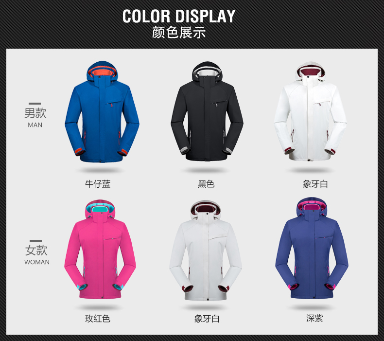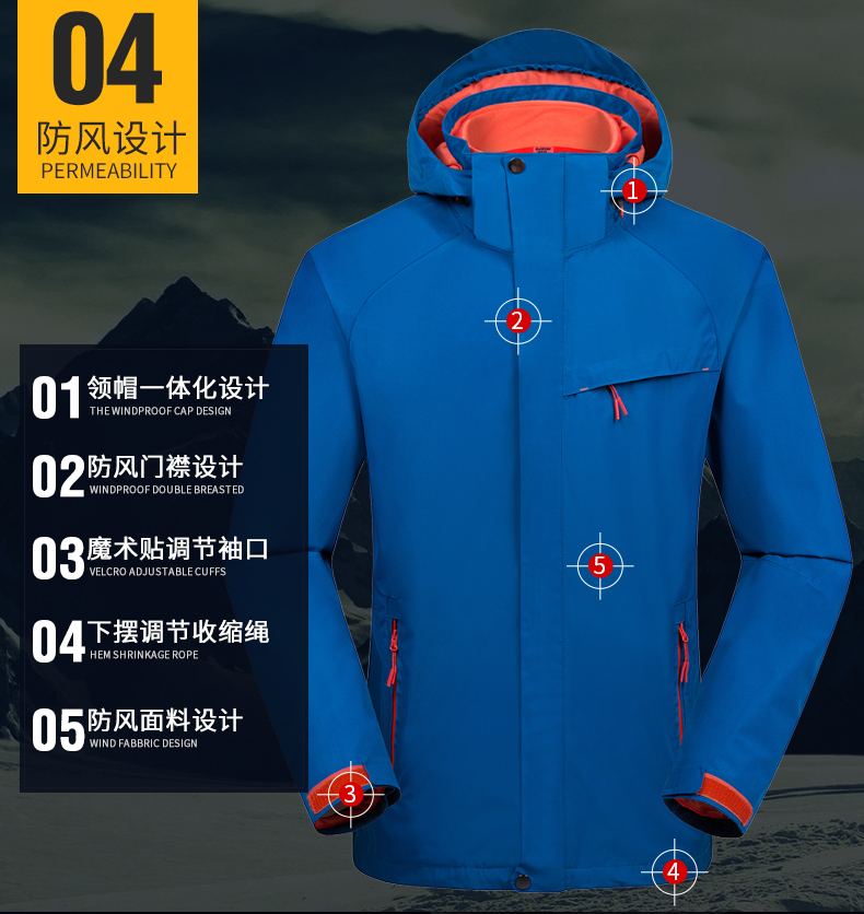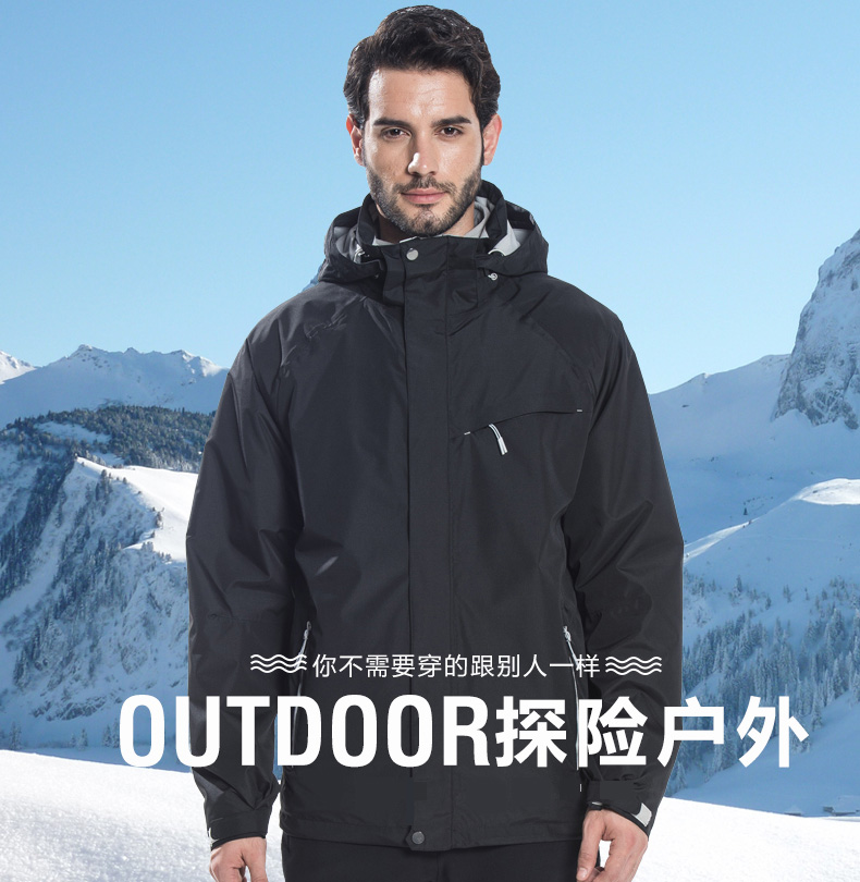 防風(fēng)防雨,鎖溫保暖,腋下透氣網(wǎng)洞,3合1沖鋒衣,內(nèi)膽可拆卸
